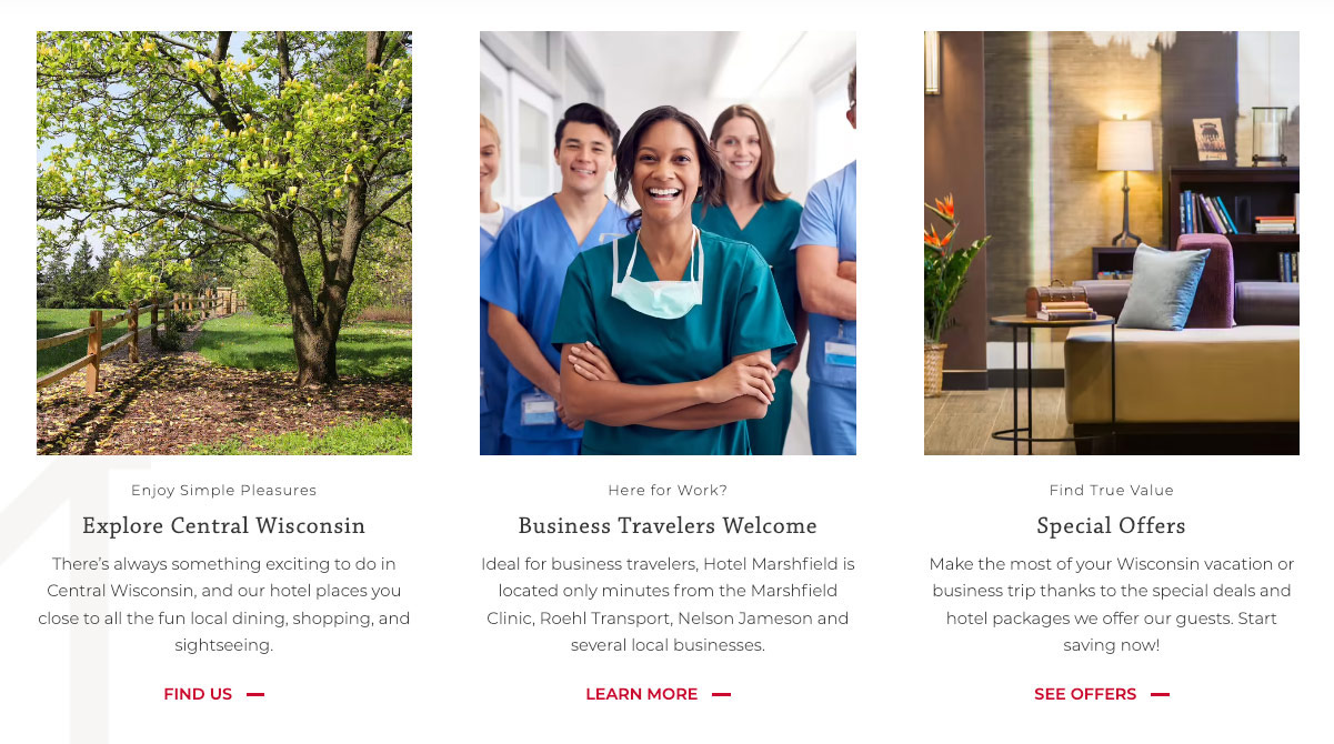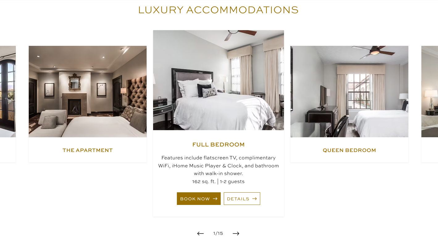 This widget builds upon our standard CTA widget by providing multiple instances presented in a horizontally rotating carousel. Feature as many promotional items, room amenities, or special areas of interest as you like. The carousel provides the user with navigation to scroll back and forth within the carousel, and is responsive and mobile-optimized. This version uses ADA Slick Version 1.8.1@accessible360.1.