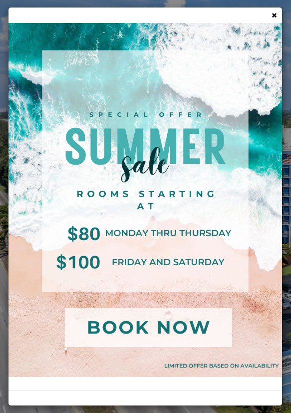 The Modal Popup widget provides a way to display unique messaging to the user in a full-width overlay, with a Call-To-Action button to encourage direct interaction. These are great for special promotions, seasonal events or important information that would benefit from a full-width, top-of-page visual placement. It provides many trigger options giving you the ability to engage users at appropriate times and with more context. This helps deliver relevant content to visitors and drive better engagement and more conversions for the website. This widget can be used to reduce website (or reservation) abandonment.