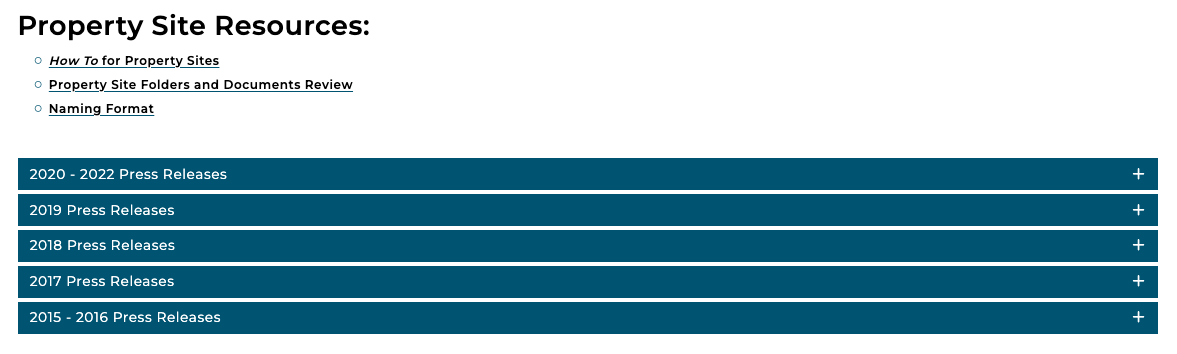 Collapsible content areas that, when clicked, display and hide content within a panel. Each panel can be set individually to display open or closed when the page first loads. Additional abilities include having the accordion panel scroll to the top of the panel when opened; opening the accordion panel from an external link; and showcasing a carousel of images per panel.