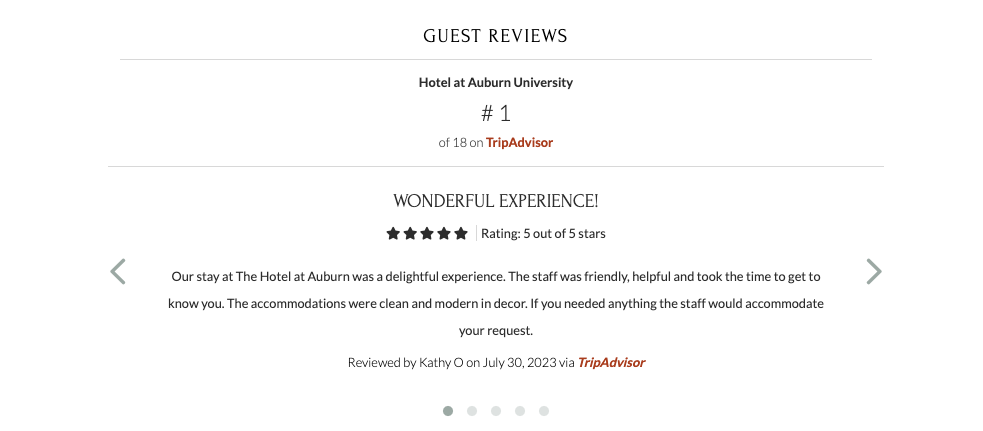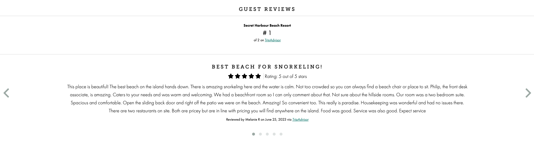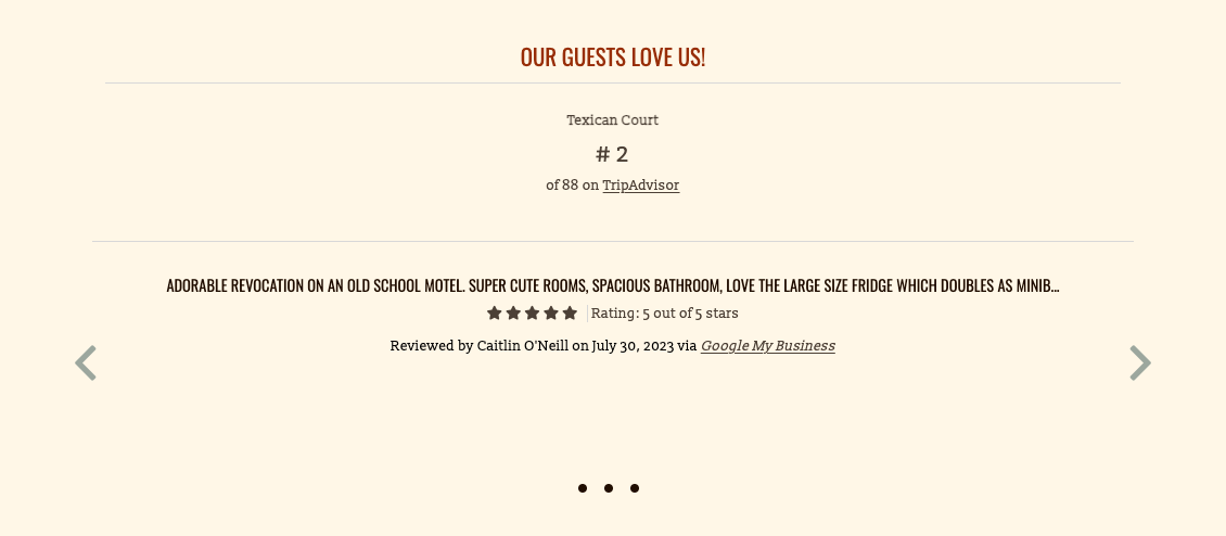 Feeds in the latest reviews from sources like Expedia, TripAdvisor, Booking.com, Hotels.com, Google My Business, Yelp, and OpenTable. Filters are available to only show positive reviews. For instance only showing reviews with ratings greater than 3 stars and that don't contain the words "horrible", "bad" etc.