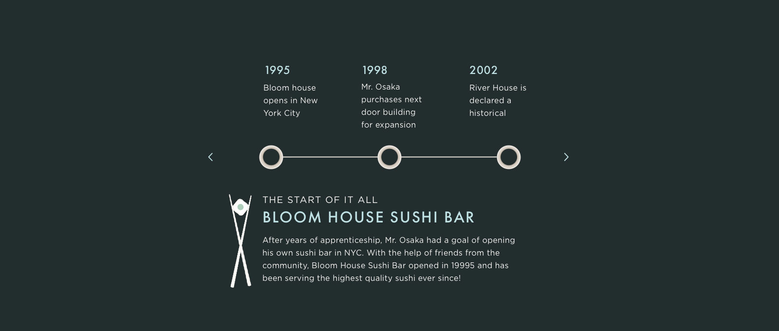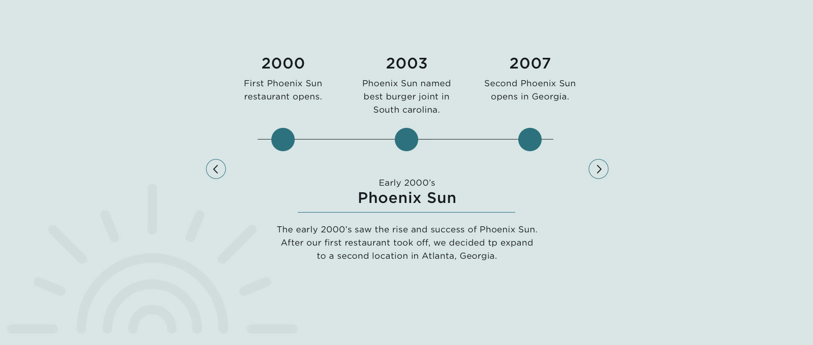 The Timeline widget provides a way to showcase important points in time in a manner that functions like a carousel, with an interactive horizontal bar with points in time represented as navigation circles. Add as many entries as needed, the widget is responsive so it adapts to mobile as well as tablet and desktop sizes.